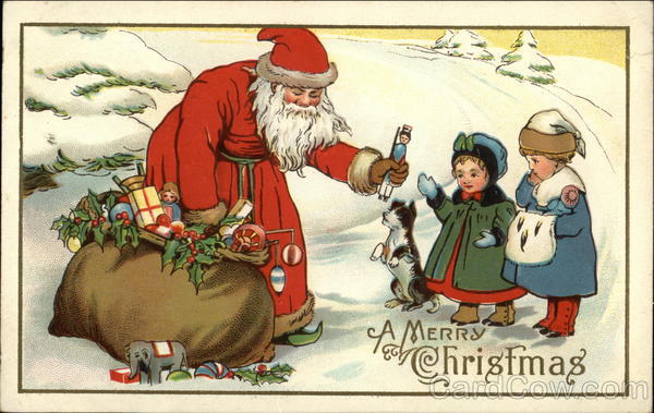 Santa Giving Presents To Two Children And A Dog Santa Claus via www.cardcow.com